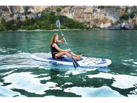 Deska posiada możliwość przypięcia specjalnego krzesełka kajakowego oraz wałka do oparcia stóp, które znajdziesz w zestawie. Dzięki temu Twój paddleboard będzie mógł też pełnić rolę kajaka. Dołączone do zestawu wiosło można też przekształcić w dwustronne wiosło kajakowe! H-F Oceana Combo Set będzie odpowiednia do rekreacyjnego pływania dla osób o wadze w okolicach 110kg.